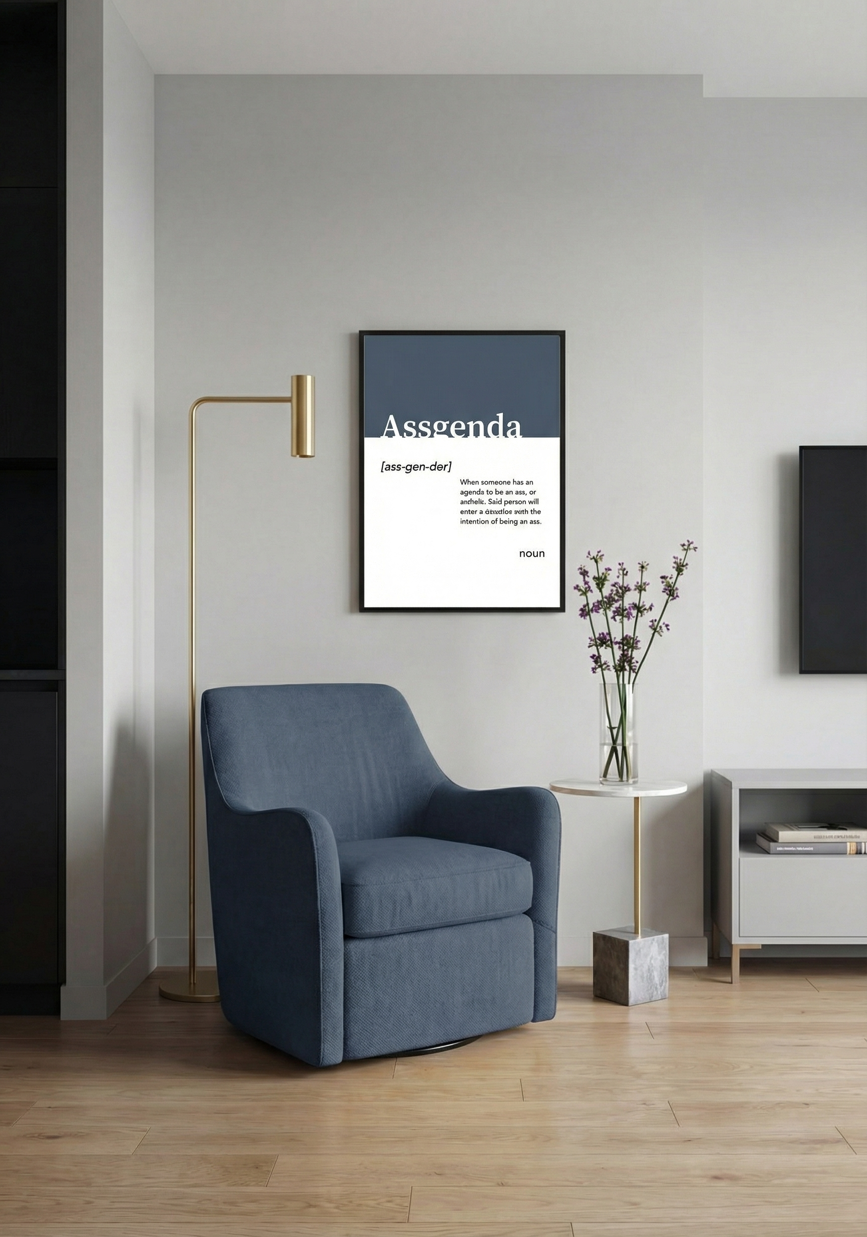 The Assgenda Alt-dictionary Print captures the energy of someone who walks into a situation already planning to be a pain. Designed with a bold slate blue header and clean typography.
