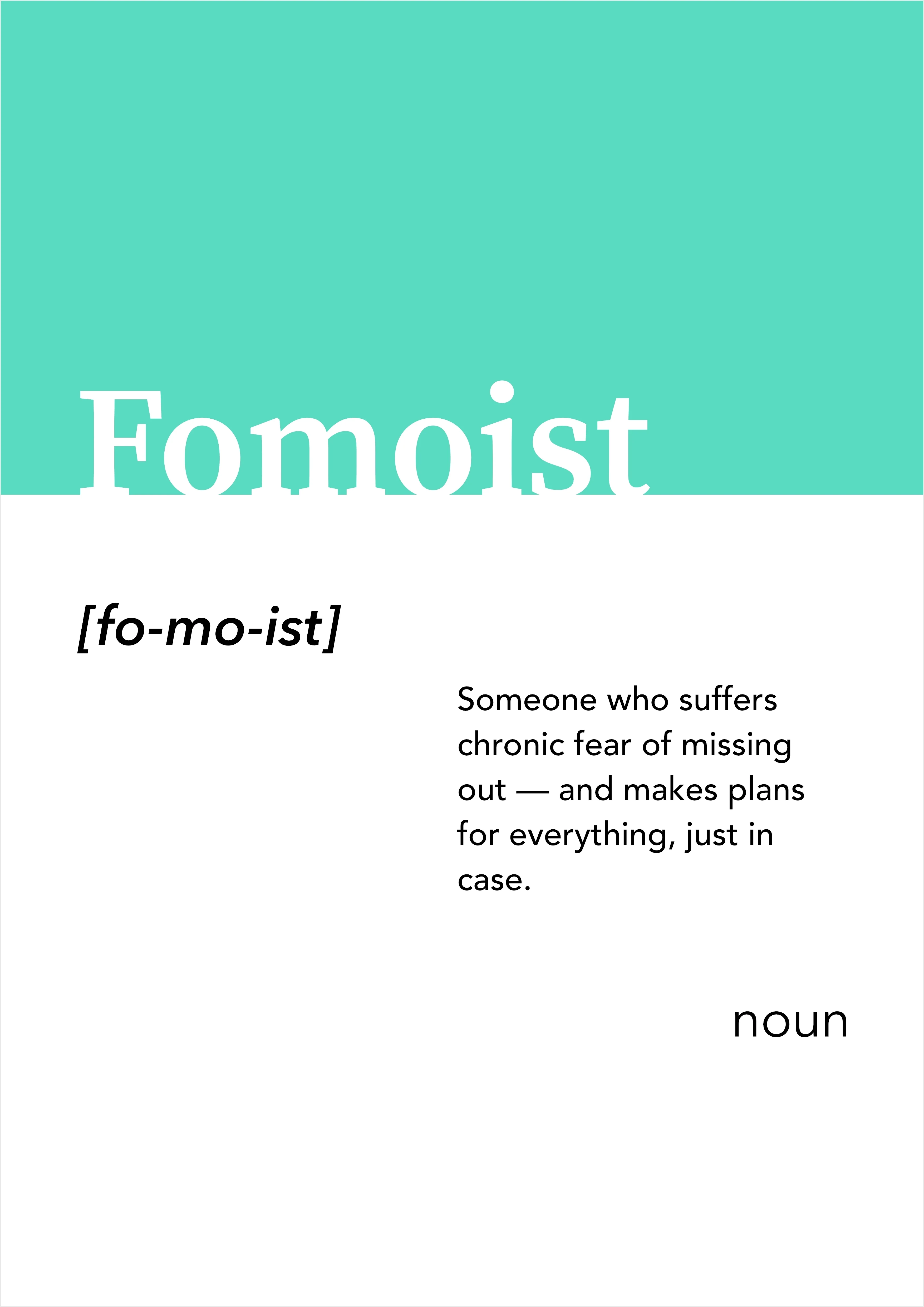 The Fomoist Alt-dictionary Print captures the chronic fear of missing out and the need to make plans for everything, just in case. Designed with a bright aqua header and clean typography.