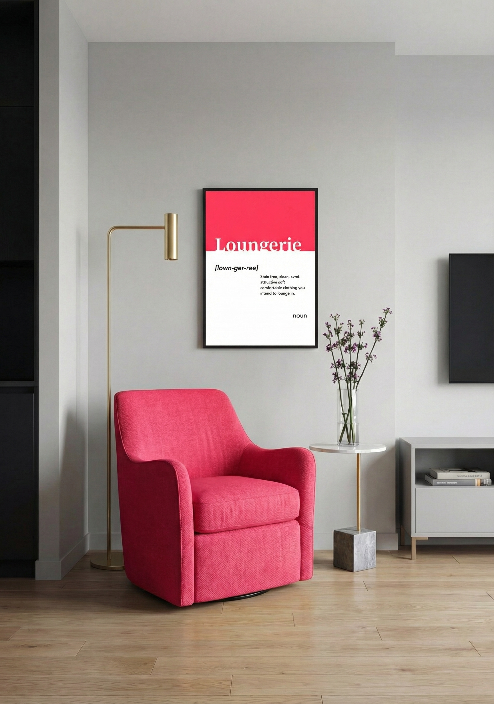 The Loungerie Alt-dictionary Print celebrates clean, comfortable, semi-attractive clothing designed purely for lounging. Designed with a bold coral-pink header and clean typography.