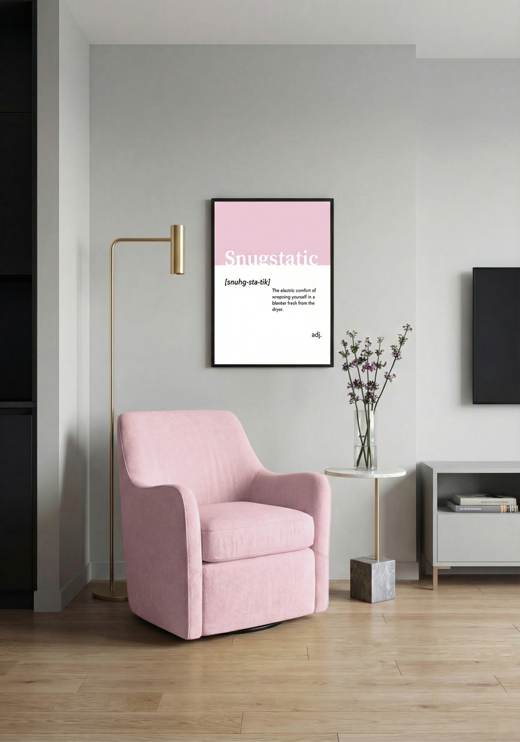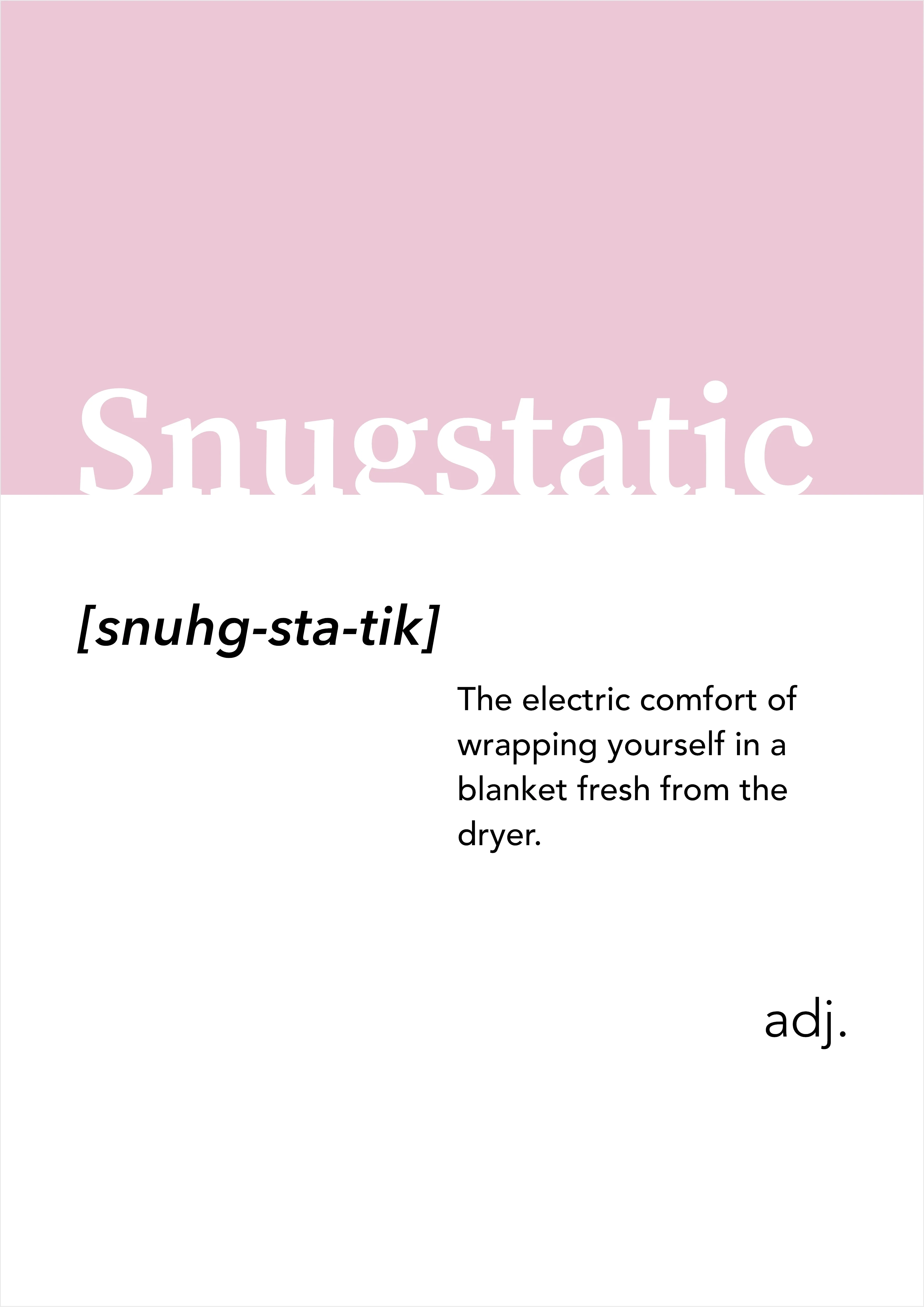 The Snugstatic Alt-dictionary Print captures the electric comfort of wrapping yourself in a blanket fresh from the dryer. Designed with a soft blush-pink header and clean typography.