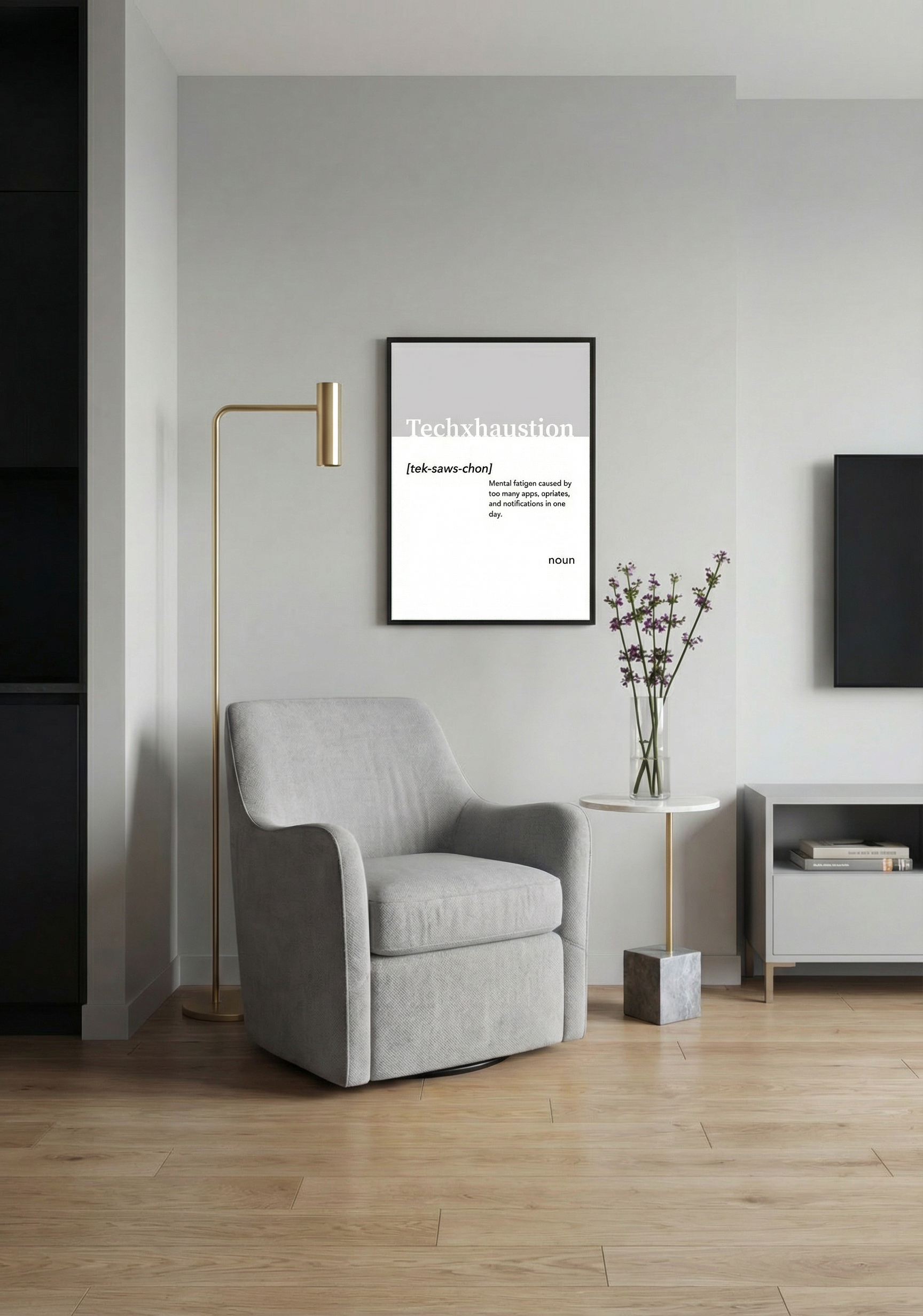 The Techxhaustion Alt-dictionary Print captures the mental fatigue caused by too many apps, updates and notifications in a single day. Designed with a cool grey header and clean typography.